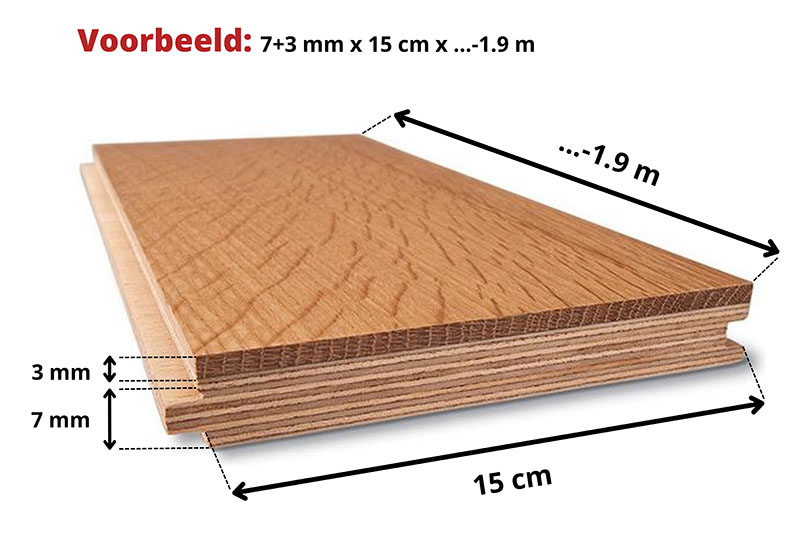 De dikte van de toplaag kan 2 mm tot 6 mm dik zijn. Bij elke parketvloer is dat vermeld. Bijvoorbeeld: 7+3mm X 15cm X ...-1.9m. In dit geval is de toplaag 3 mm.